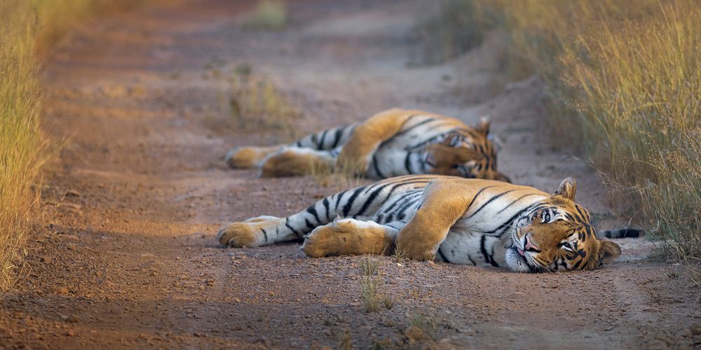 Two young adult tiger cubs rest in the early morning light at Tadoba Andhari Tiger Reserve, India.
